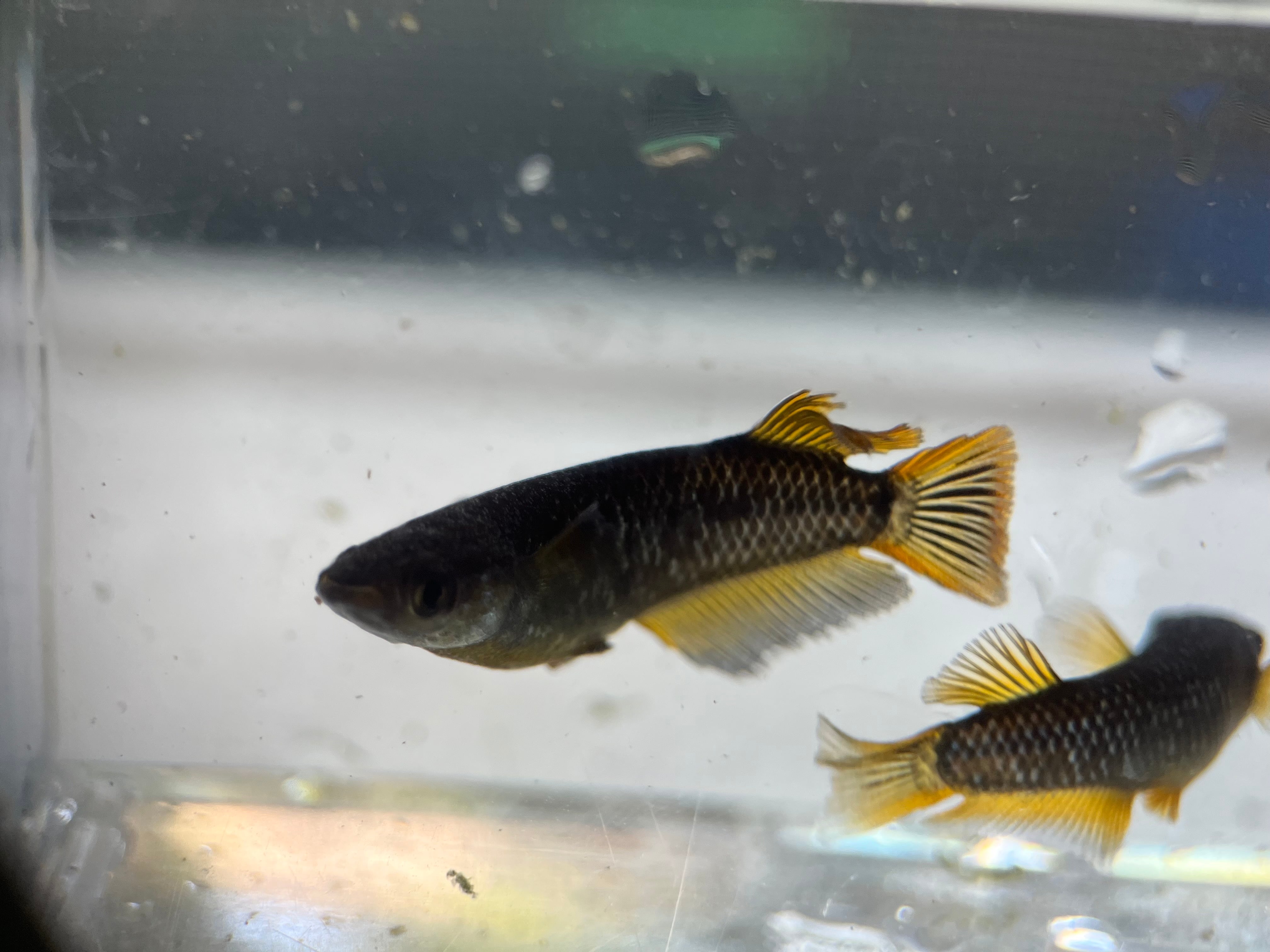 Black Mamba is an improved medaka created by crossbreeding "Midnight Frill Shikkoku Type" and "Reiwa Black Diamond." It was developed in 2023. This medaka features the jet-black body and glitter on the sides from the Midnight Frill, combined with the Reiwa gene that turns the fins orange. It is hardy, produces many eggs, and is easy to care for.